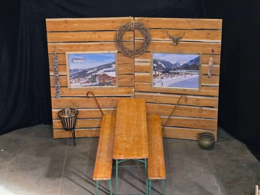 Door de combinatie van houtstructuur en wintersportbeelden ontstaat direct een herkenbare Alpen sfeer. Dit maakt het decor zeer geschikt voor evenementen waar beleving centraal staat.