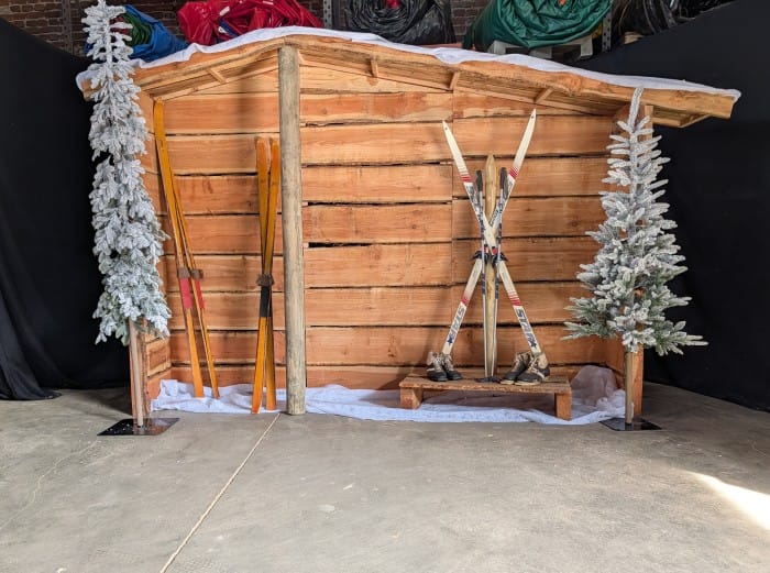 De decorwand is opgebouwd uit robuust hout en aangekleed met authentieke elementen zoals ski’s en sneeuwdecoratie. Hierdoor past deze perfect binnen een après ski thema, winterfeest of kerst evenement.