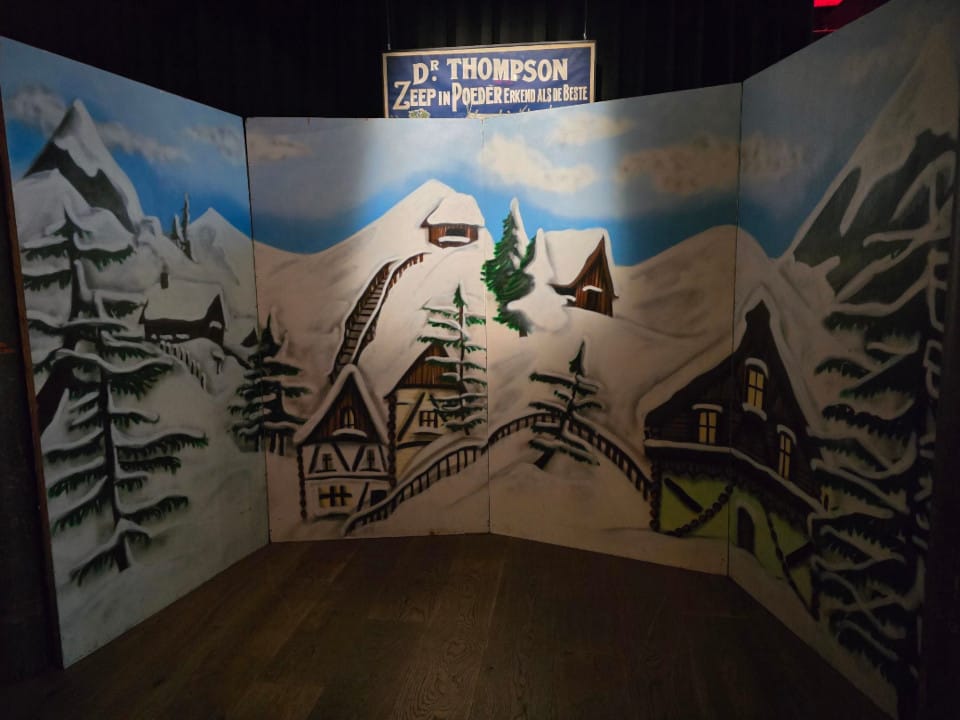 De Tirol decorwand geeft het gevoel alsof je midden in een wintersportgebied staat. De schildering van besneeuwde bergen en alpine huizen zorgt voor een warme en herkenbare wintersport sfeer.