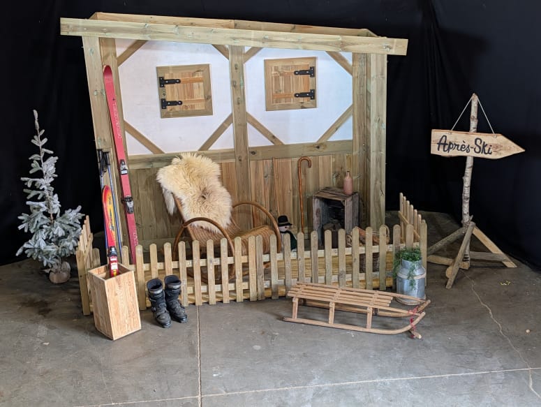 Ook voor een après ski feest is het houten vakwerkhuisje een ideale decoratie. Door het huisje te combineren met ski’s, houten tonnen en winterse accessoires ontstaat een gezellige Alpen sfeer.
