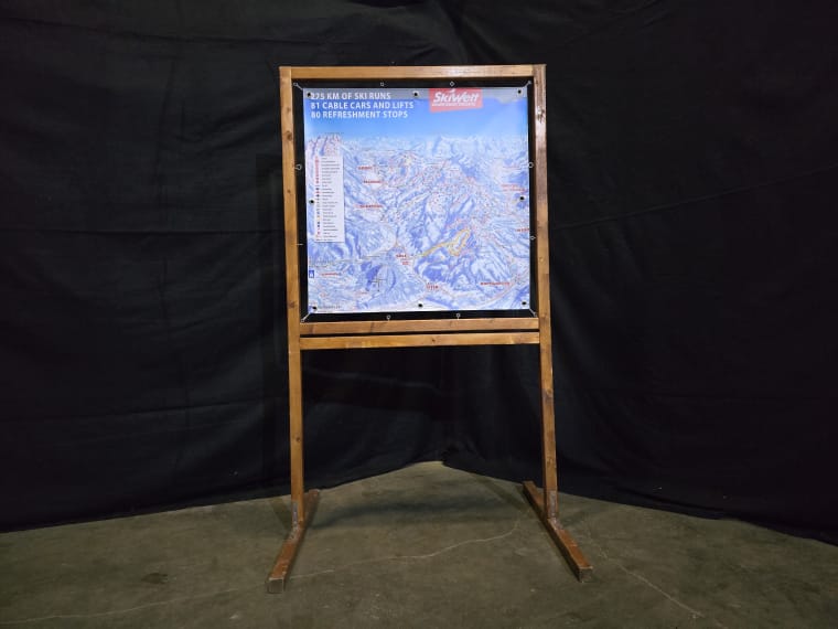 De houten standaard en duidelijke wintersport kaart zorgen voor een realistische en professionele uitstraling.