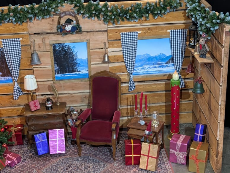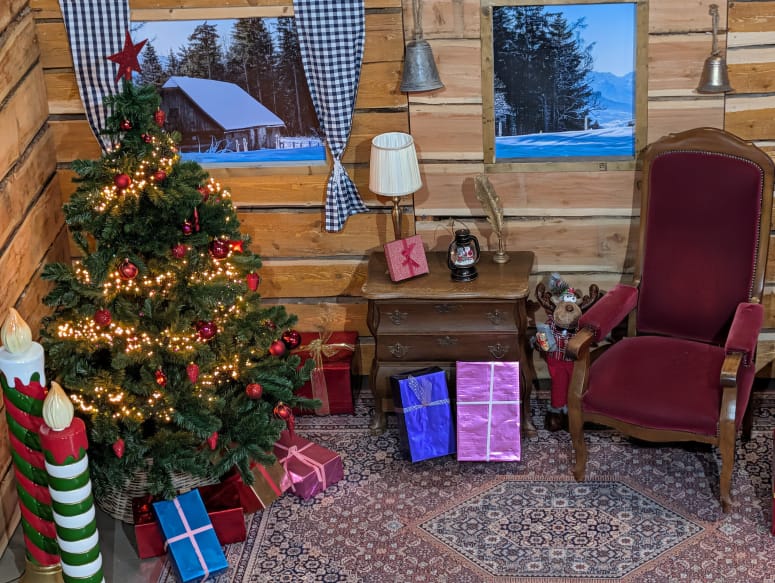 De decoratie bestaat onder andere uit een sfeervolle kerstboom met verlichting, cadeautjes, een klassieke kerststoel voor de kerstman en diverse winterse accessoires. Hierdoor ontstaat een herkenbare en uitnodigende setting waar bezoekers graag foto’s maken.